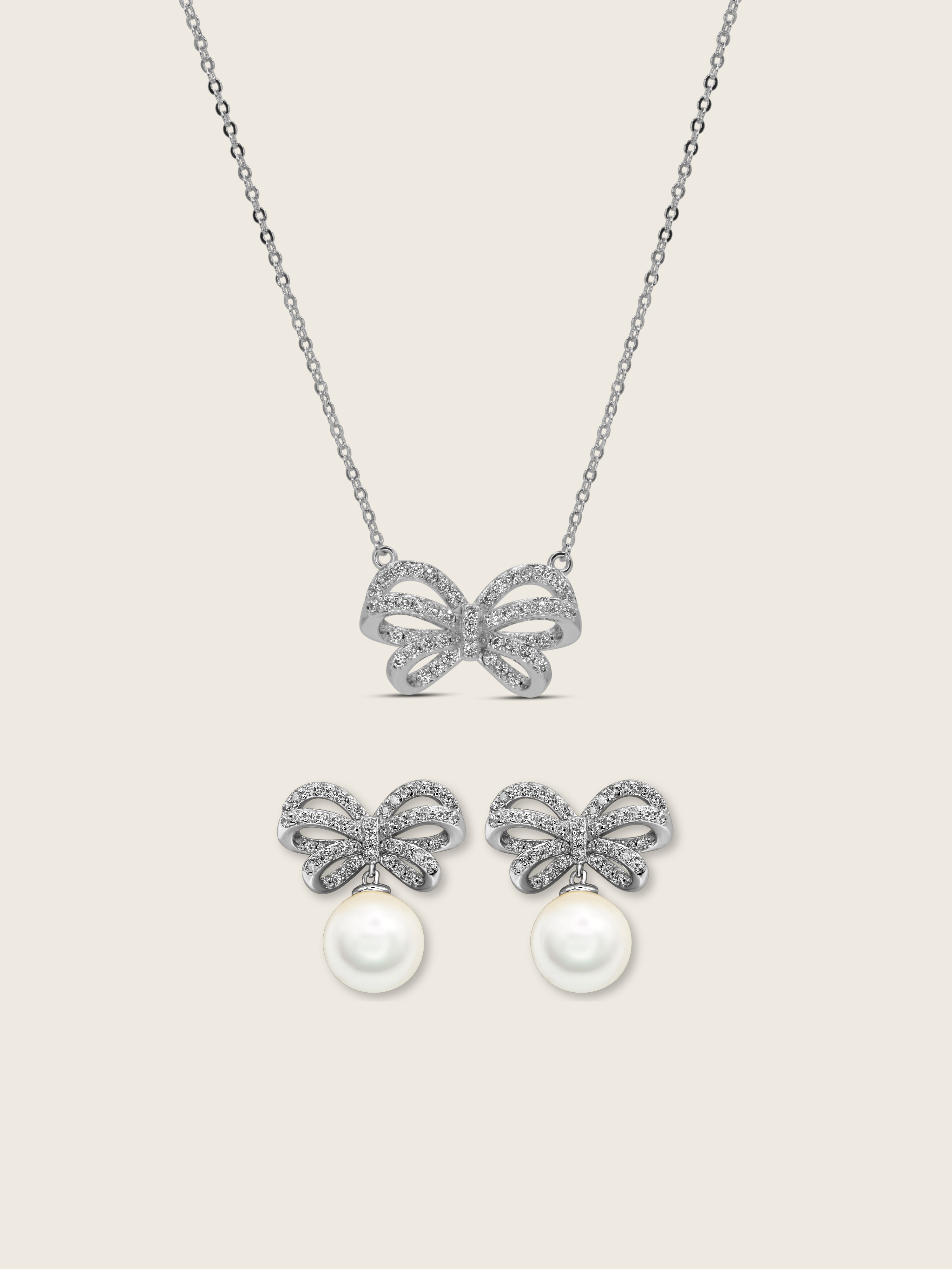 The earrings are crafted in white gold plating, detailed with pavé-set CZ stones that glisten beautifully, and finished with radiant shell pearl drops for a timeless touch. The matching necklace echoes the bow design, suspended on a fine chain that catches the light with subtle sophistication.
