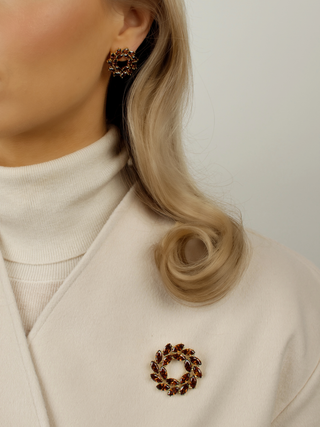 Close-up of model wearing Diana earrings with deep wine-coloured cubic zirconia in a vintage-style gold setting