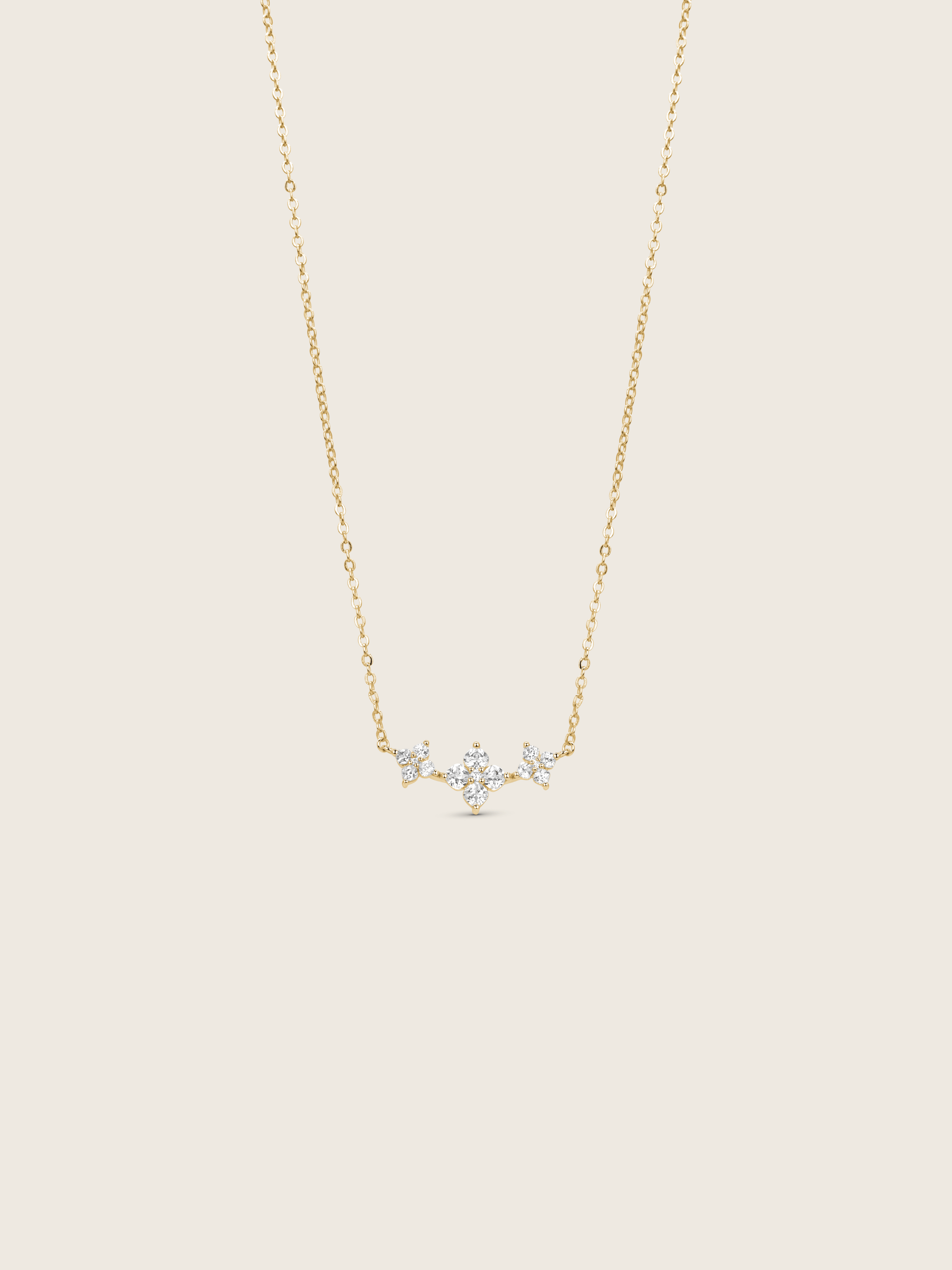 Delicately detailed and beautifully balanced, this necklace features three petite hydrangea motifs arranged in a refined trio at the centre of the neckline. Finished in warm 14k gold plating, this necklace sits elegantly at the collarbone, perfect for everyday wear or subtle layering.