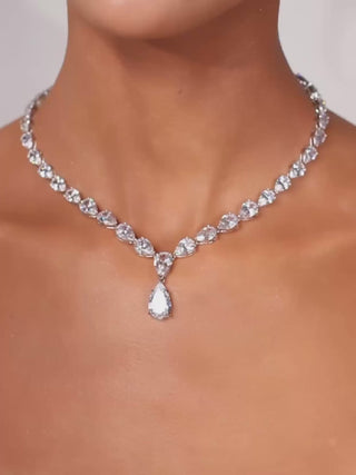 Designed to dazzle, the Aurora Necklace is a striking piece crafted for unforgettable moments. Featuring a row of brilliant pear-cut cubic zirconia stones in a classic white gold setting, each gem catches the light beautifully, cascading into a bold centre drop. Whether worn for a wedding or a statement evening look, Aurora brings radiance and glamour in equal measure.