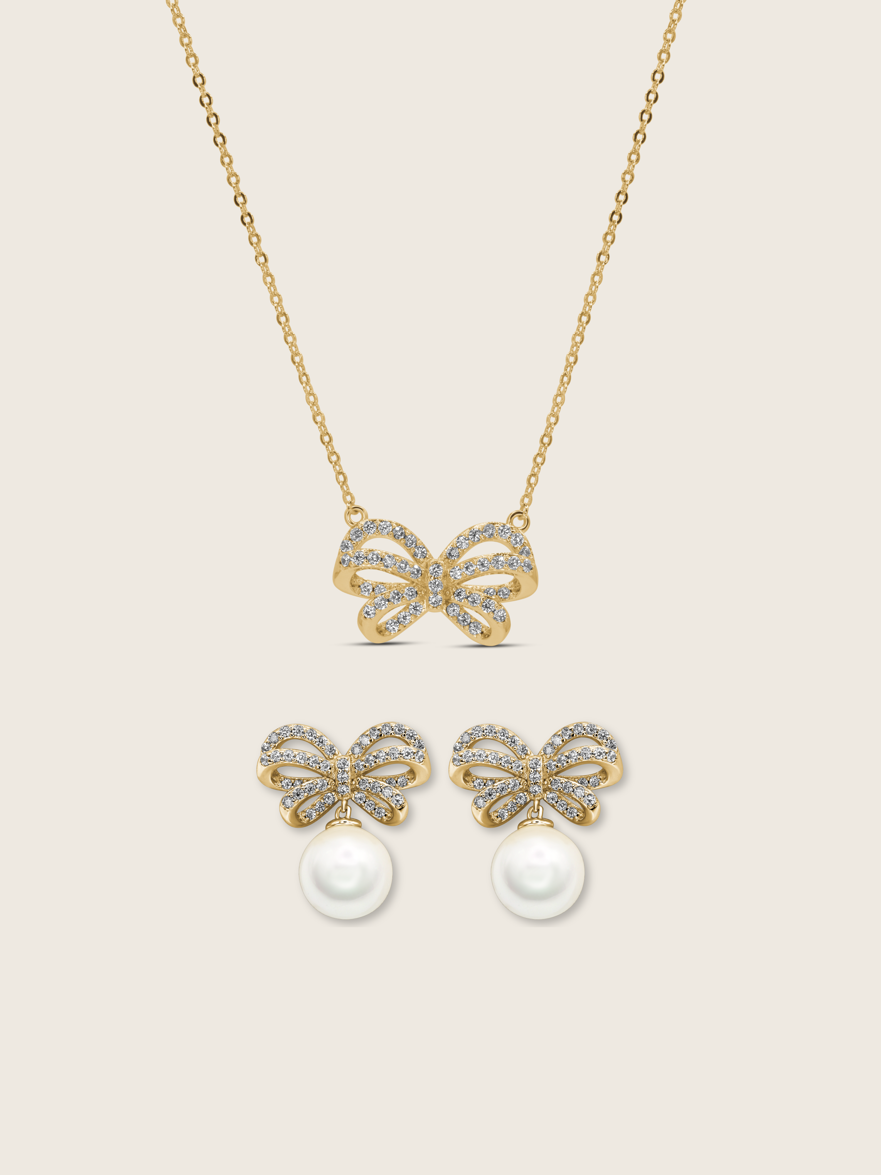 Each earring is crafted in 14k gold plating, adorned with delicate CZ stones that shimmer with every movement, and finished with a luminous shell pearl drop for a touch of sophistication. The matching necklace mirrors the bow design, sitting delicately along a fine chain to create a cohesive, polished look.