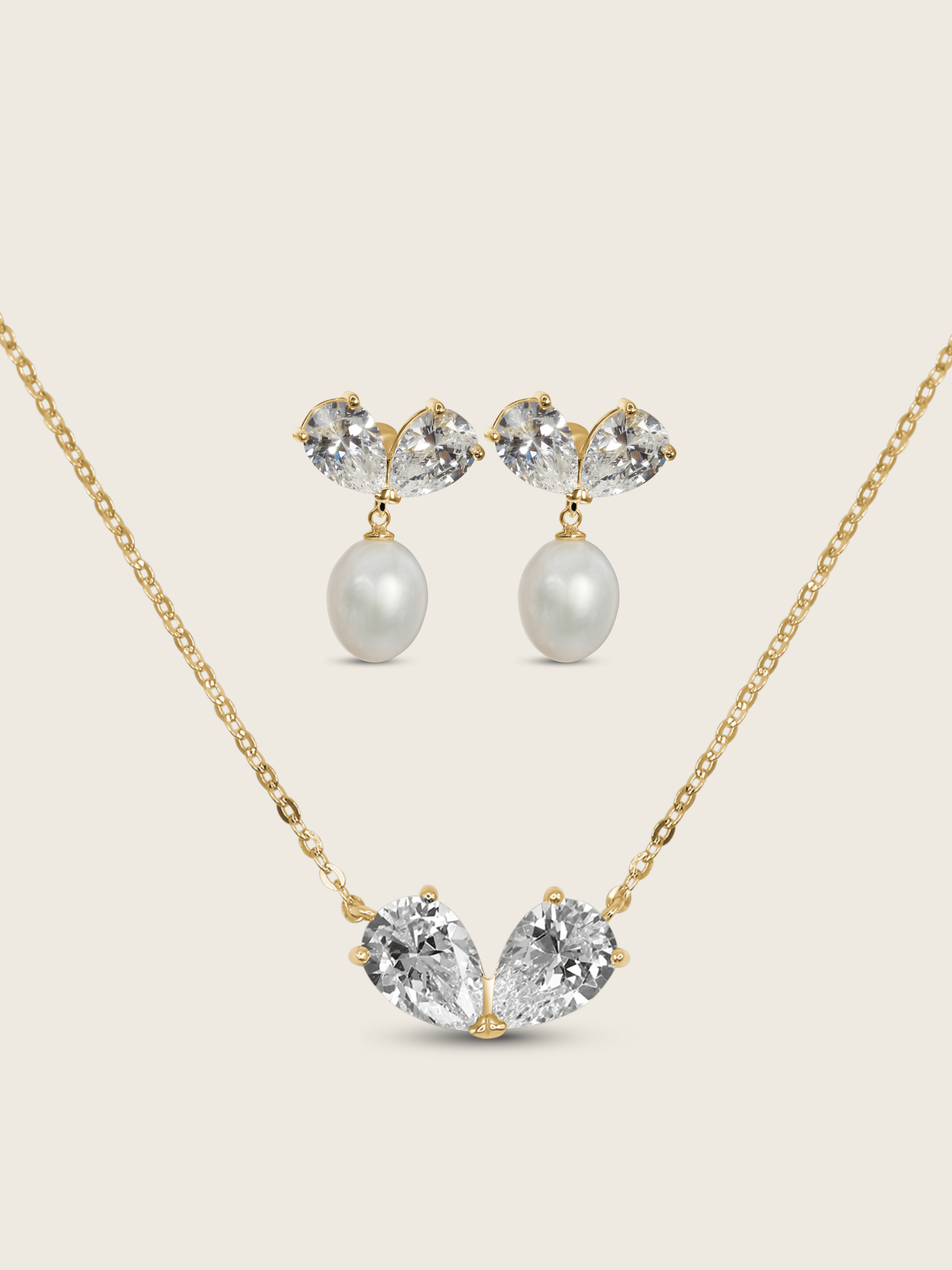 Each earring features two sparkling pear-cut CZ stones set in 14k gold plated sterling silver, finished with a freshwater pearl drop for a touch of classic elegance. The coordinating necklace mirrors the design with twin pear-cut stones resting gracefully along a fine gold chain, catching the light with every movement.