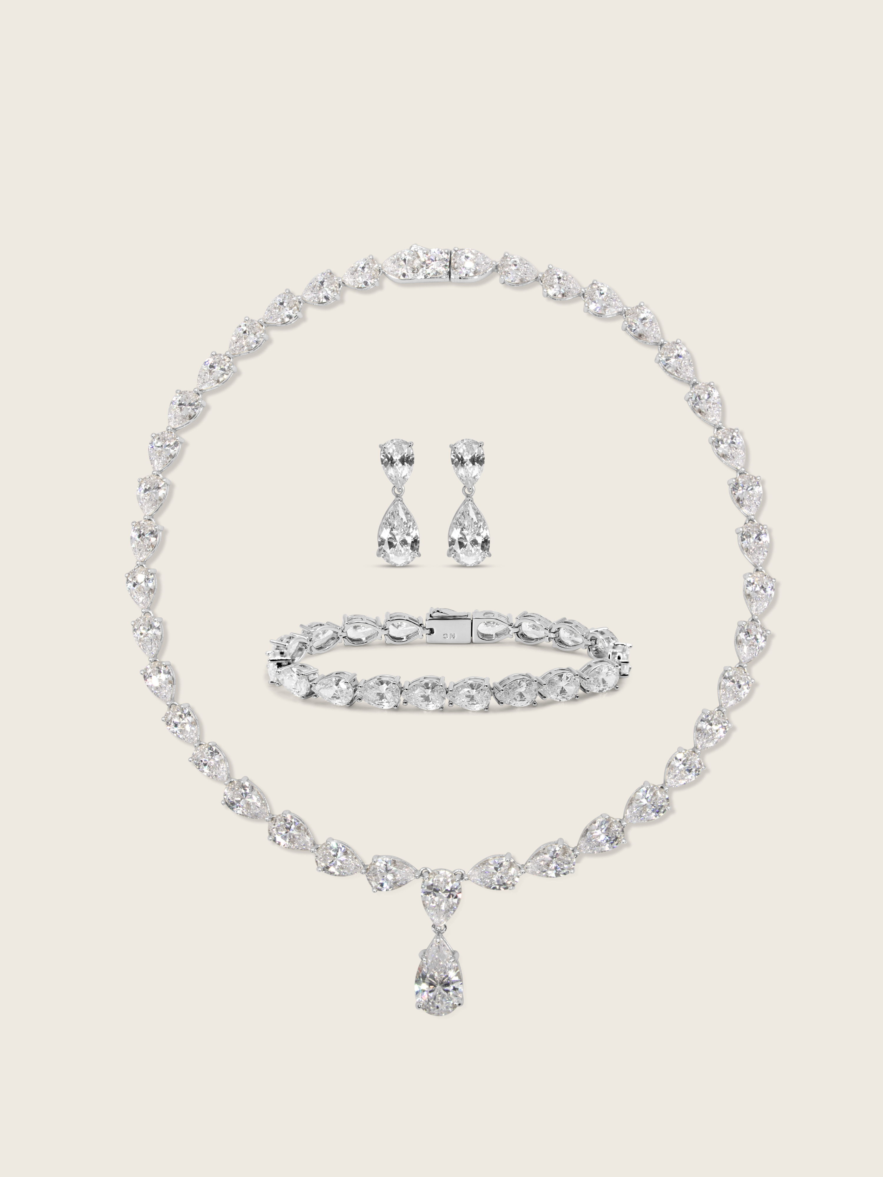 The much loved Aurora design is now available as a complete set, finished in premium White Gold plating for a cool, refined brilliance. Featuring the distinctive pear stone cut, this set is a flawless choice for wedding jewellery - timeless, radiant, and beautifully coordinated to complement any bridal look.