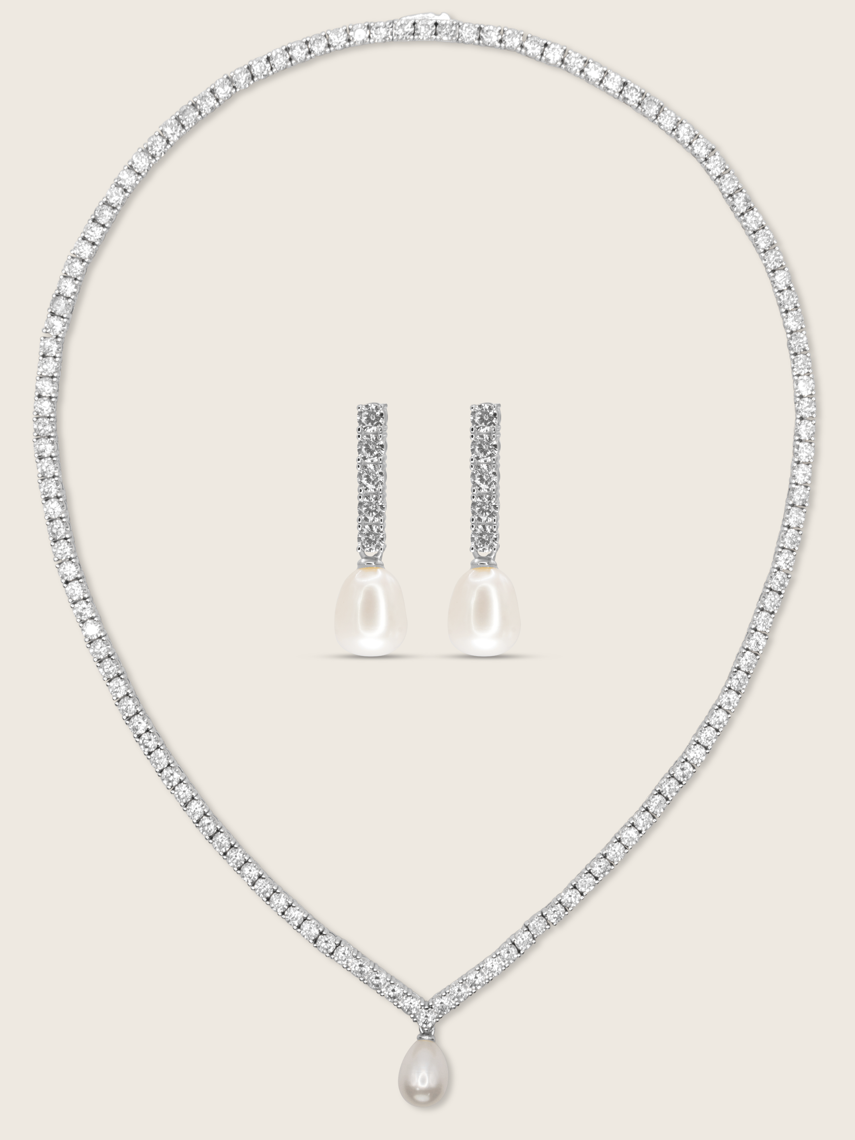 The earrings feature a line of sparkling CZ stones, finished with a single freshwater pearl drop that moves gracefully with each step. The matching necklace completes the set with a sleek tennis-style chain, leading to a central freshwater pearl pendant. The perfect balance of refinement and radiance.