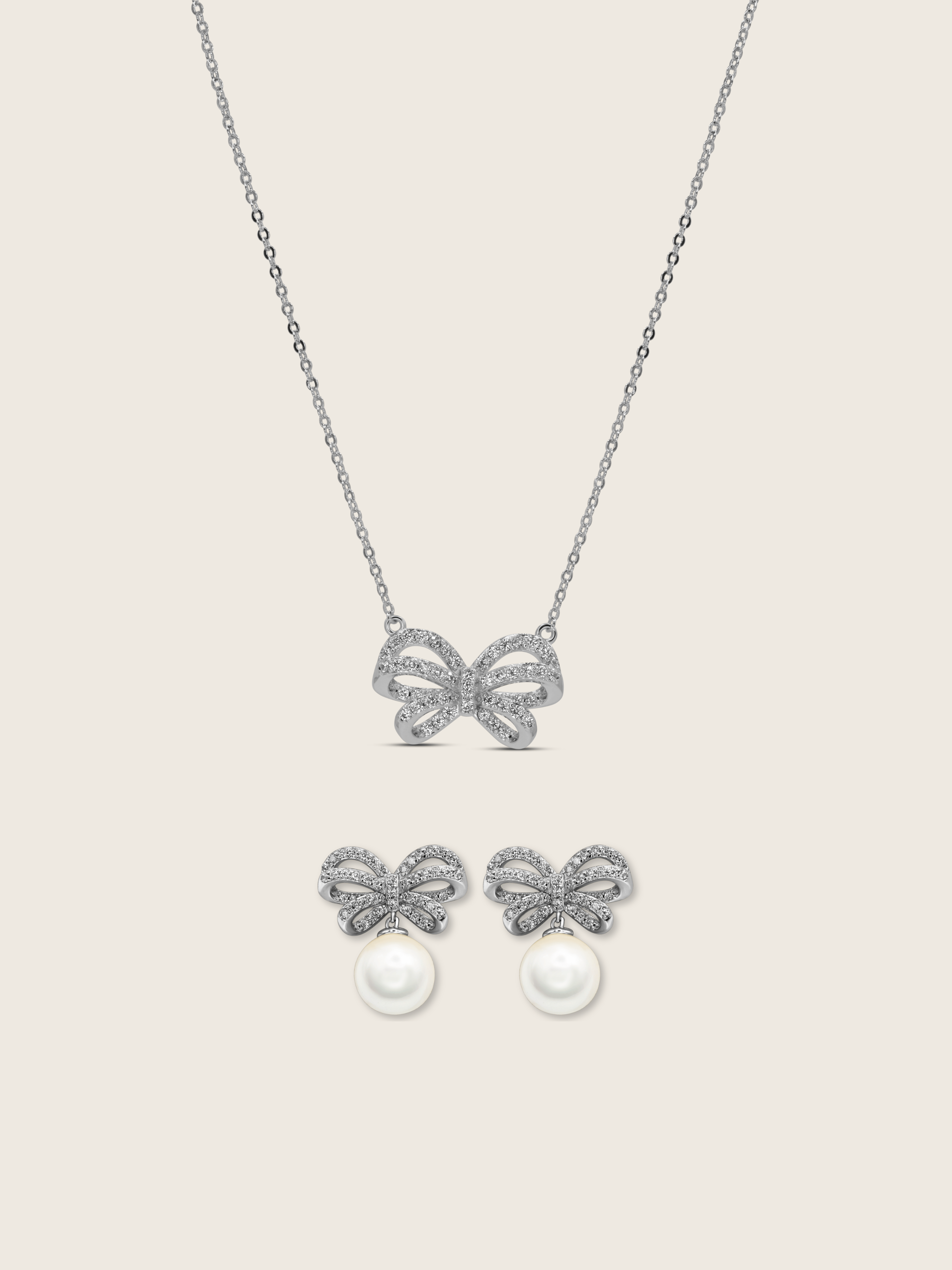 The earrings are crafted in white gold plating, detailed with pavé-set CZ stones that glisten beautifully, and finished with radiant shell pearl drops for a timeless touch. The matching necklace echoes the bow design, suspended on a fine chain that catches the light with subtle sophistication.