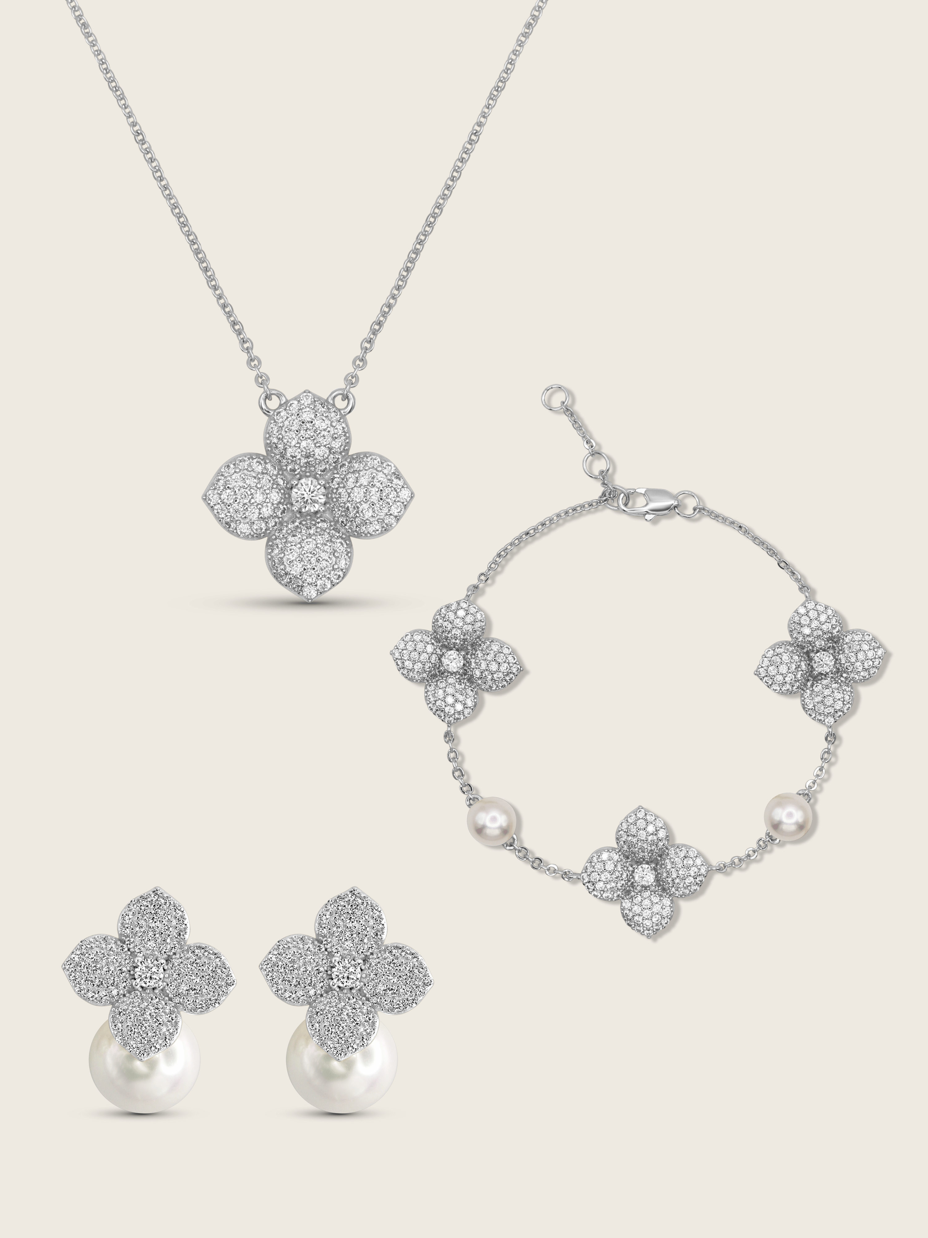 The matching bracelet features luminous freshwater pearls nestled between the sparkling blossoms, adding a delicate touch of texture and refinement to the set. Paired with the coordinating earrings and necklace, the ensemble radiates a quietly luxurious charm that complements every occasion - from intimate celebrations to the most special days of your life.