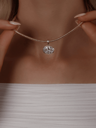 Closeup of Muriel necklace on model’s neck, featuring overlapping shell designs in gold